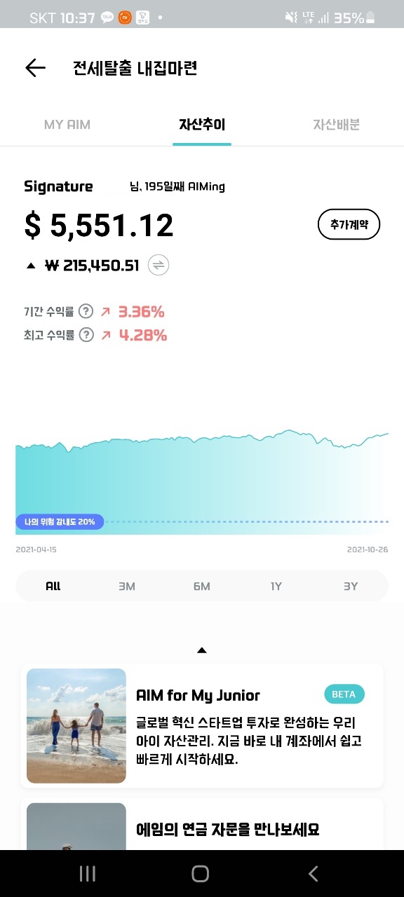 사람들에 따라 생각이 다르지는 모르겠지만 나의 경우는 에임처럼 투자에 대한 자문을 받고 승인하는 과정이 좀 더 Private 하고 세심한 관리를 받는것 같다는 느낌을 받을수 있었다. 이 회사가 내세우는대로 상위 1% 자산관리 서비스라는 슬로건에 맞게 고액자산가가 주로 투자자문서비스를 받는것을 생각하면 내 자산을 좀 더 소중하게 생각할 수 있는 계기도 마련할수 있다고 생각한다.