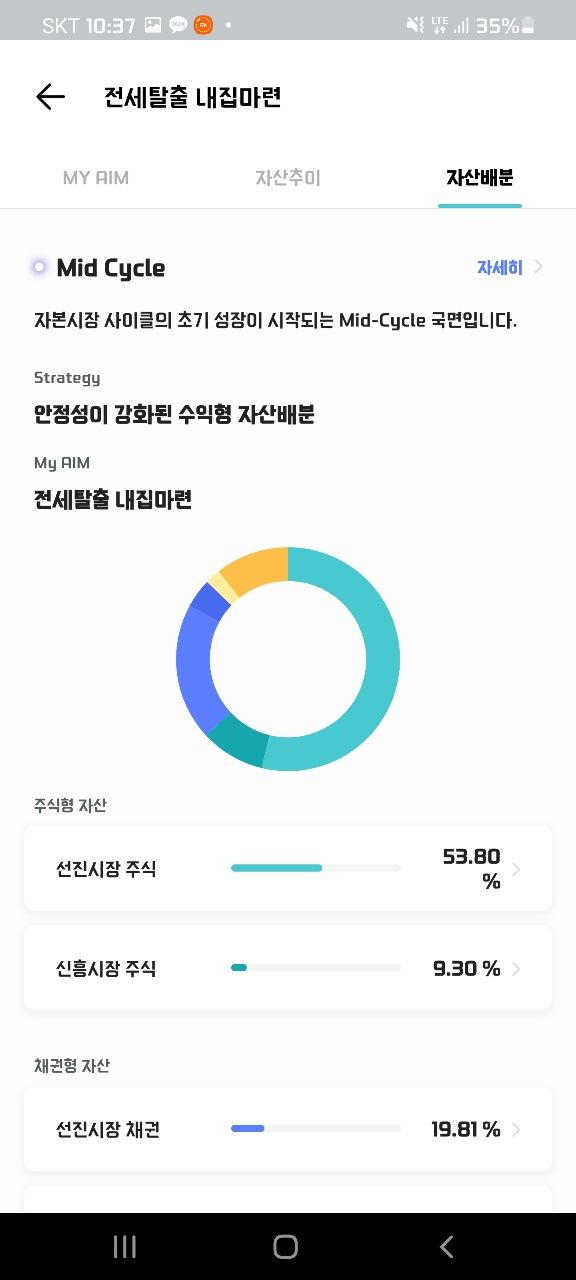 처음 가입시 투자전략은 "내집마련 전세탈출" 로써 조금 중위험의 투자 전략을 취하고 있는데 주식형 63.10% 채권형 24.03% 기타자산 12.87%에 투자하고 있다. 주식형의 경우 해외 FTF 중심이며 미국/일본/독일의 기업 및 산업에 분산 투자하고 있다. 채권도 마찬가지로 장기채, 기업채 등에 분산투자를 하고 있으며 대체자산으로 금/현금/부동산(ETF) 등에 투자를 하고 있다.